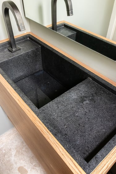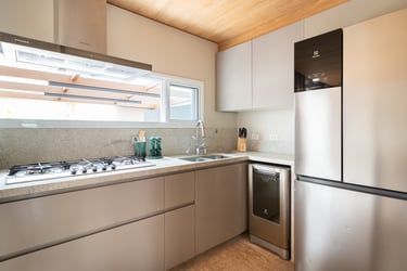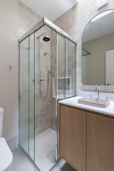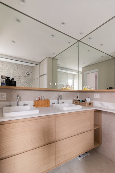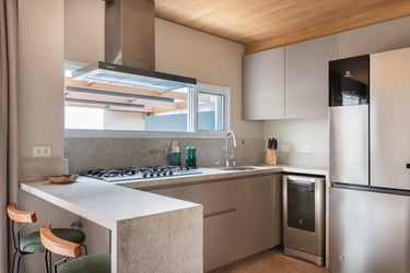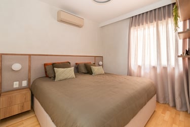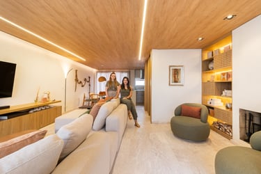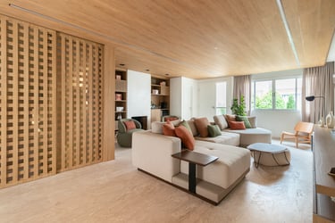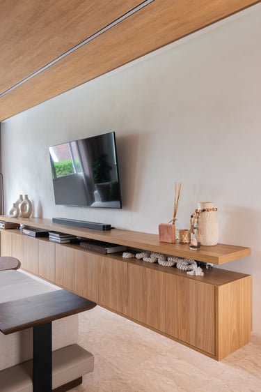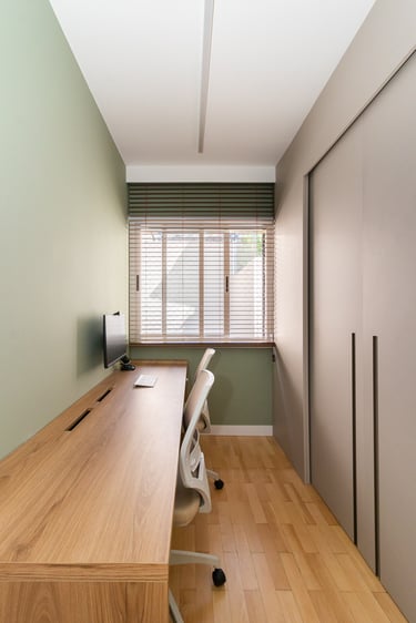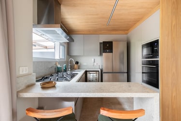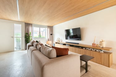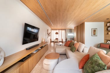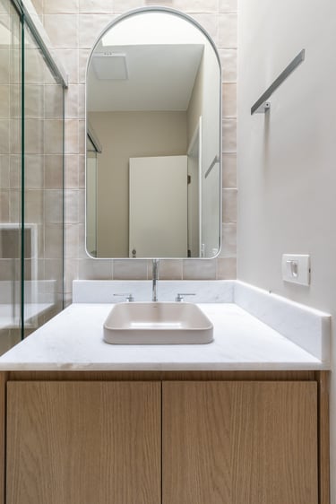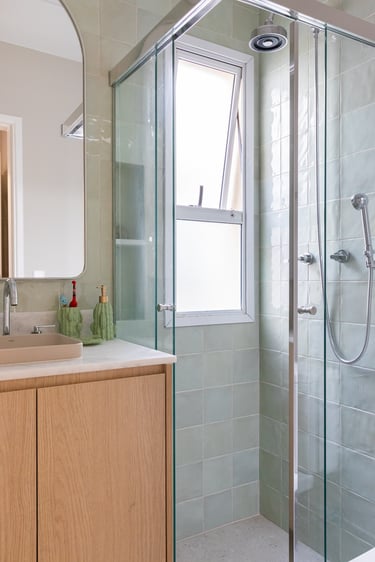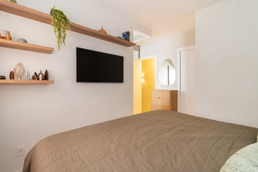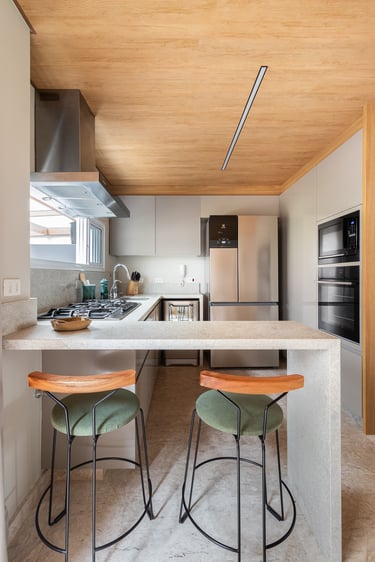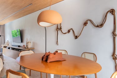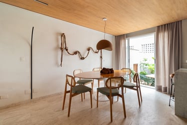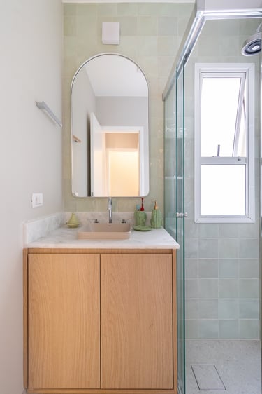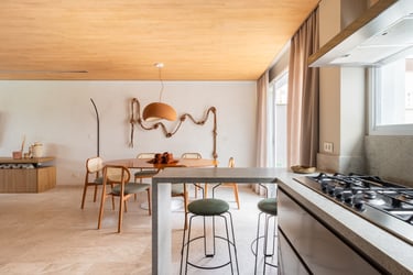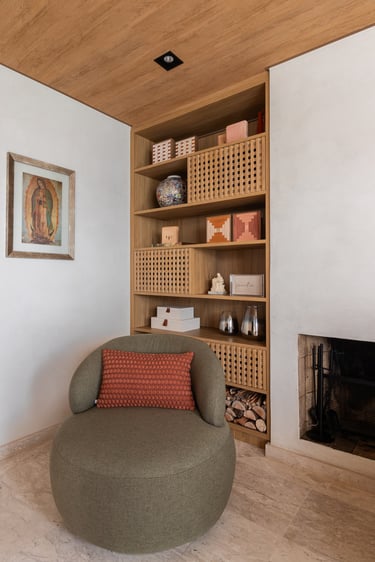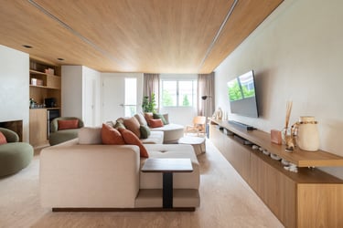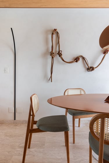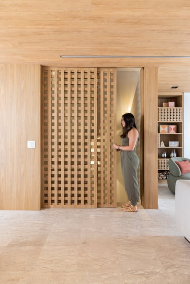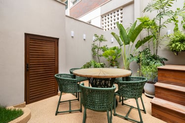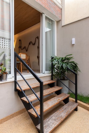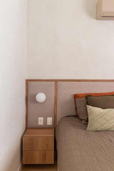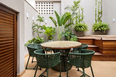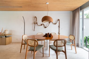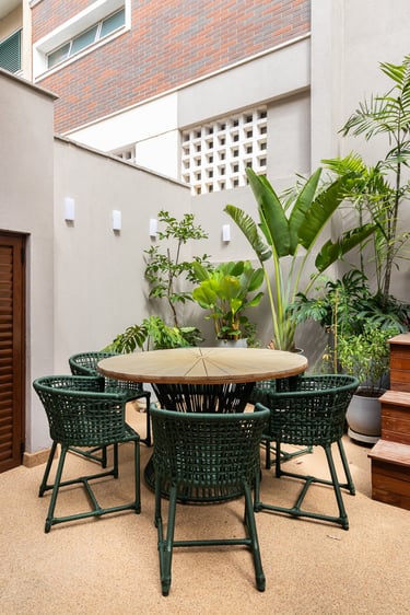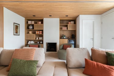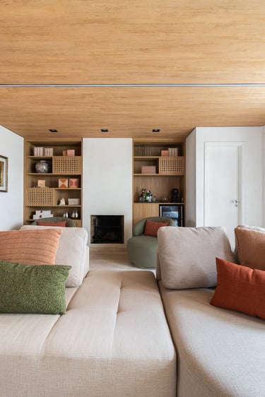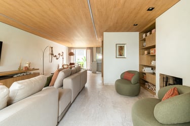 Para o projeto desta casa que pertence a um jovem casal, optamos por uma paleta de tons terrosos: verde, terracota e muita madeira!