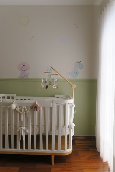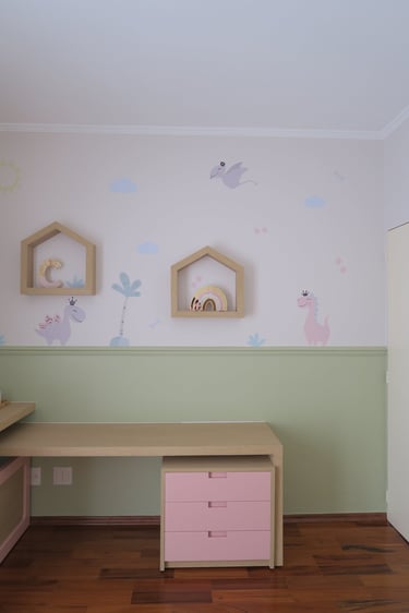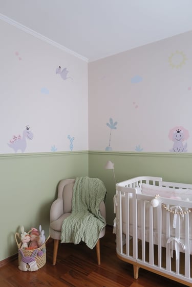 Utilizamos meia parede em pintura no tom principal do quarto e a metade superior num tom neutro com adesivos de dinossauro, que dão tema ao quarto.