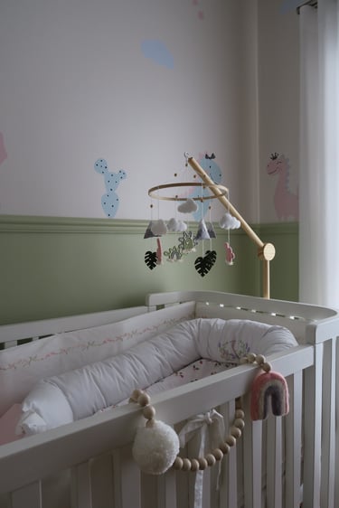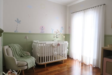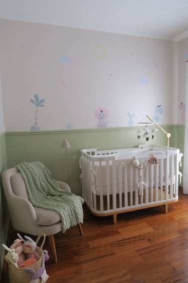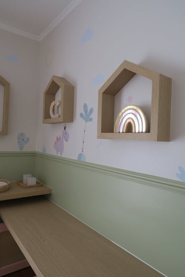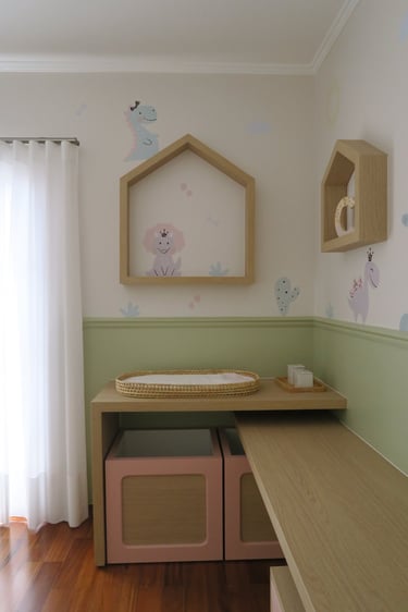 Neste quartinho, elegemos uma paleta suave, feminina fugindo um pouco do comum com a predominância do verde.