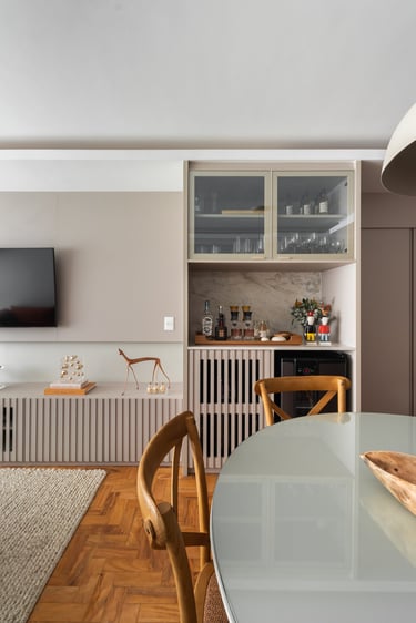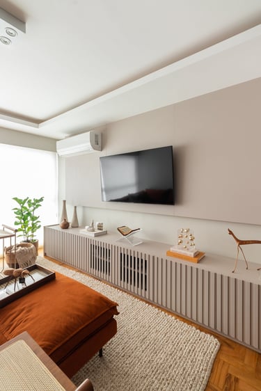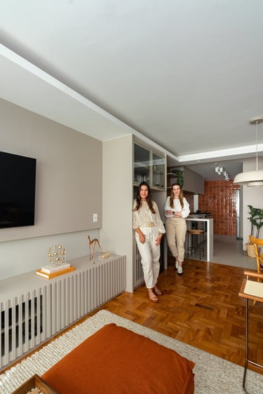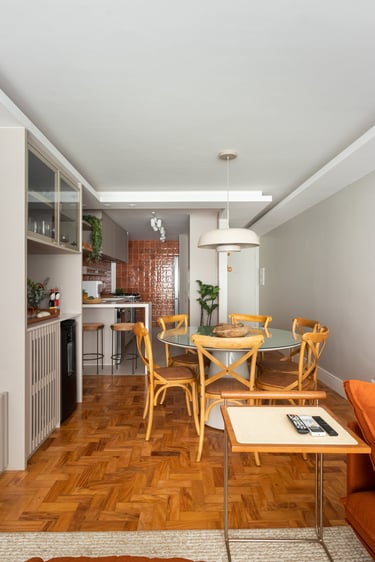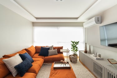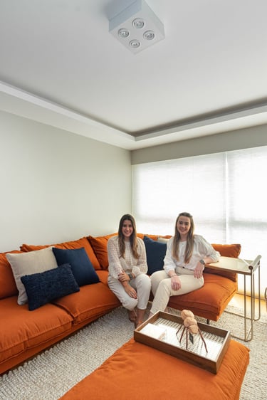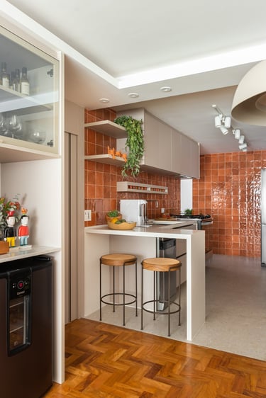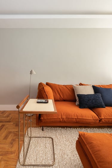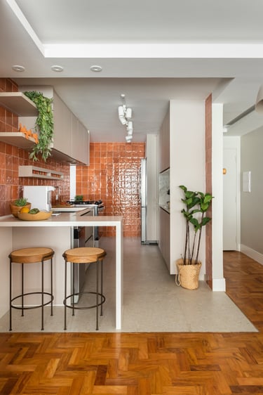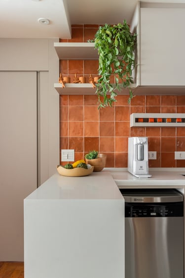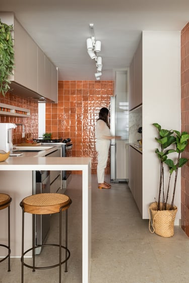 Para a Maria e o Antônio, um casal de senhores, apostamos na cor laranja! E eles toparam. Assim como no sofá da sala o laranja está presente no revestimento das paredes da cozinha e para complementar a paleta elegemos tons mais neutros como o areia, o off white e o branco.