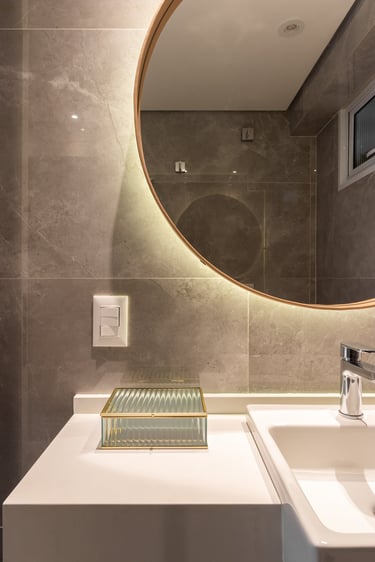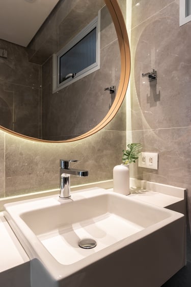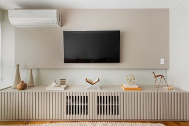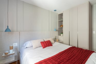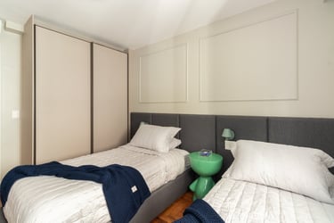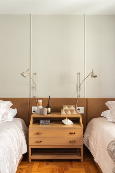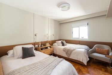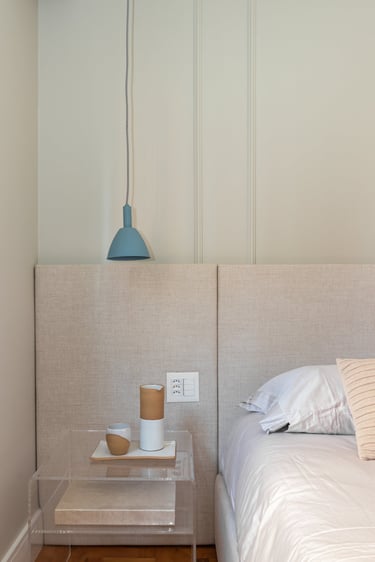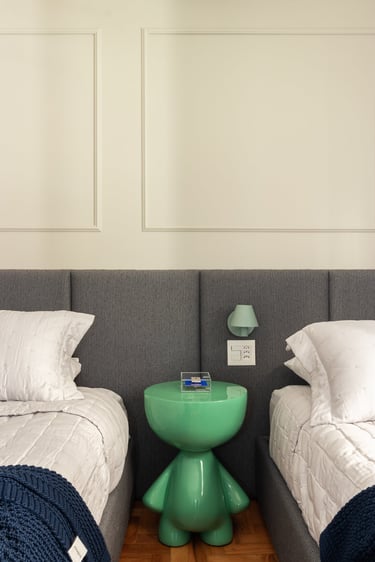 Nos quartos apostamos em tons mais neutros mas não com menos vida! Seguimos a paleta do caramelo no quarto do casal, um mix de azul e verde para o quanto onde eles receberão os netos e para o quarto de hóspedes tons neutros com detalhes apenas na roupa de cama.