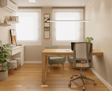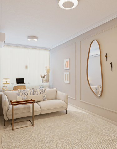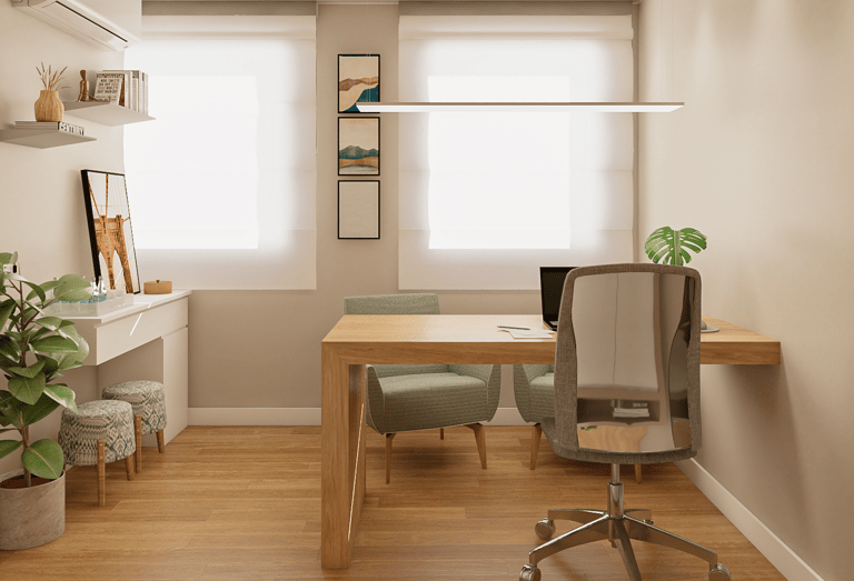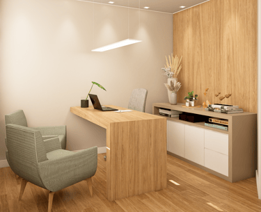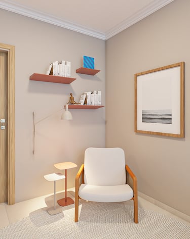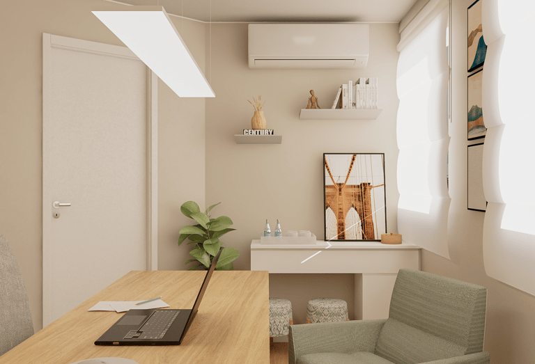 Esse é o consultório da Rê, ela é psicóloga em São Paulo e queria renovar o ambiente de atendimentos sem mudar muito. Nossa proposta foi manter a marcenaria existente e adesivar a parede principal e a mesa de atendimentos com textura de madeira, além de trazer um pouco de verde no vaso, com as plantas, e nas poltronas além de alguns objetos de decoração que ela tanto ama.