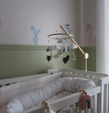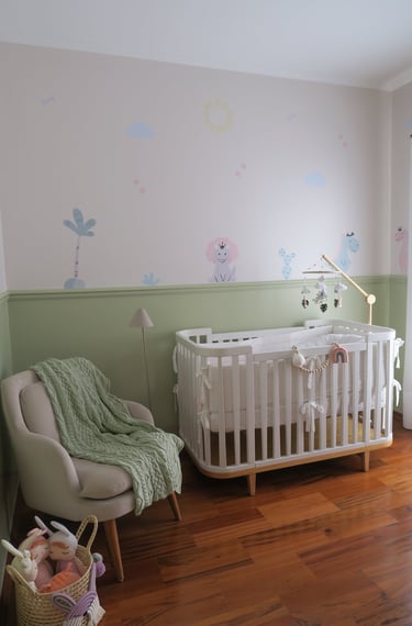 Utilizamos meia parede em pintura no tom principal do quarto e a metade superior num tom neutro com adesivos de dinossauro, que dão tema ao quarto.