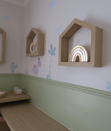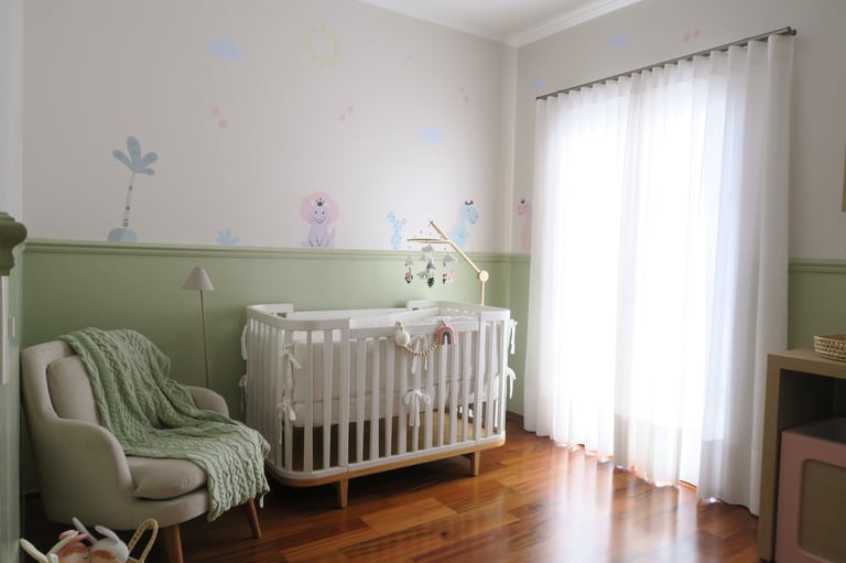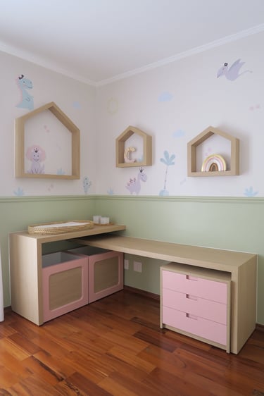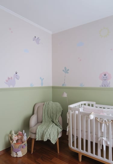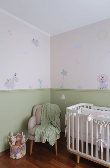 Neste quartinho, elegemos uma paleta suave, feminina fugindo um pouco do comum com a predominância do verde.