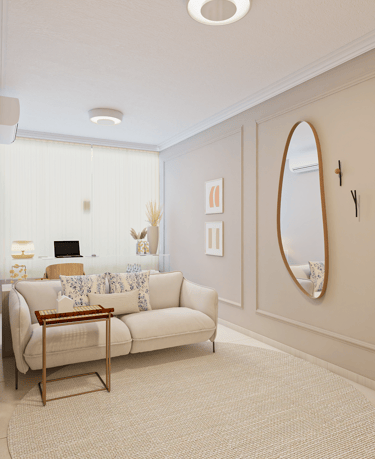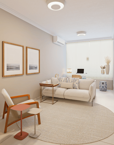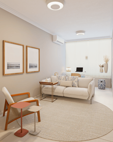 Para a Maria e o Antônio, um casal de senhores, apostamos na cor laranja! E eles toparam. Assim como no sofá da sala o laranja está presente no revestimento das paredes da cozinha e para complementar a paleta elegemos tons mais neutros como o areia, o off white e o branco.