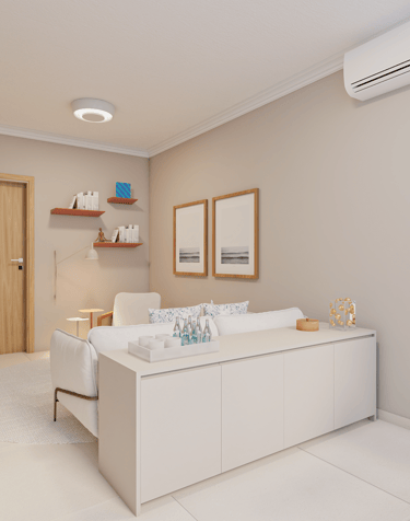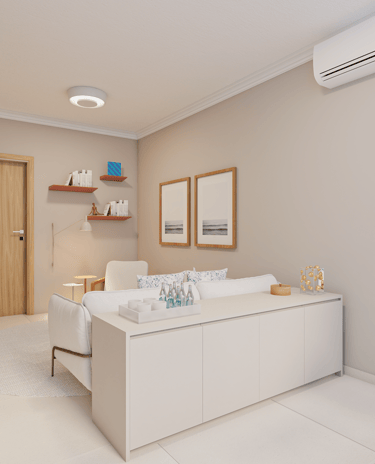 Propusemos uma pequena alteração no layout e usamos tons claros, como a Fe queria, mas para as crianças trouxemos o colorido da cor goiaba nas mesinhas e prateleiras e estampa azuis nas almofadas do sofá.